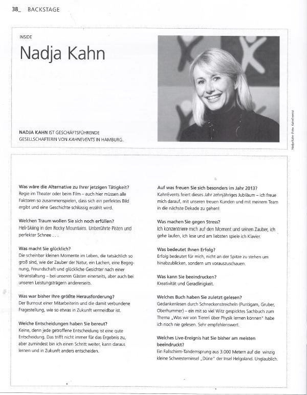 Basierend auf dem OCR-Text scheint es sich um ein Interview mit einer Person zu handeln, die in der Eventbranche tätig ist und vermutlich das Unternehmen „Kahnevents“ leitet, das sein 10-jähriges Jubiläum feiert. Hier ist ein ausführlicher Blogbeitrag zu diesem Artikel: