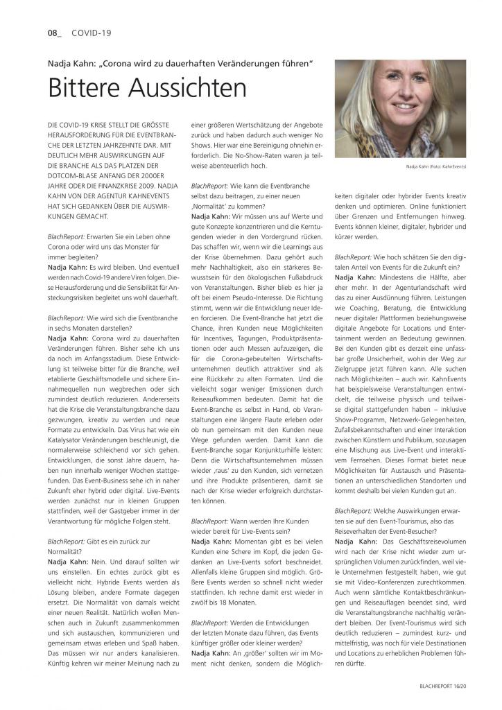 Die COVID-19 Krise stellt die größte Herausforderung für die Eventbranche der letzten Jahrzehnte dar. Nadja Kahn, Geschäftsleitung der Agentur KahnEvents hat sich im Austausch mit BlachReport Gedanken über die Auswirkungen gemacht: